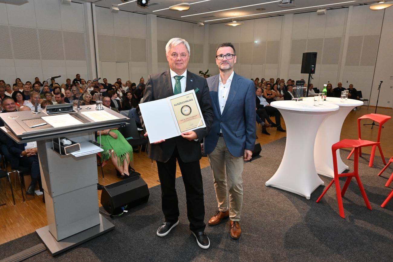 Im Rahmen der Betriebsräteversammlung überreicht Gottfried Feiertag, MSc dem Direktor für Medizin und Pflege Dr. Markus Klamminger die ZBR-Auszeichnung in Gold, bedankte sich für die gute Zusammenarbeit und wünscht ihm alles Gute für den bevorstehenden Ruhestand.